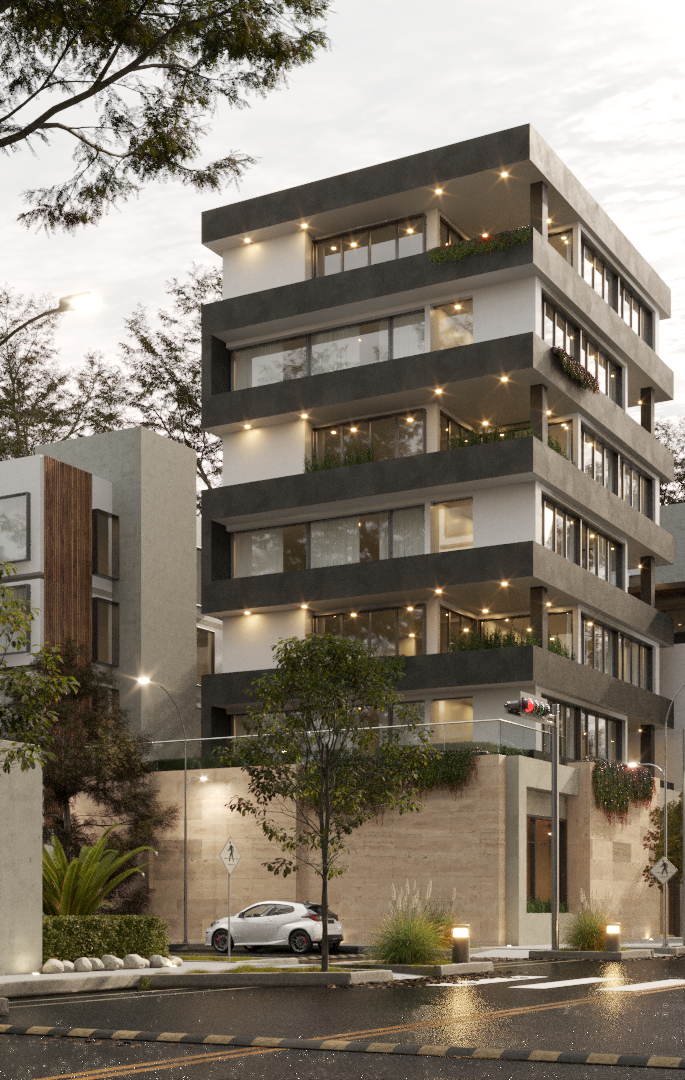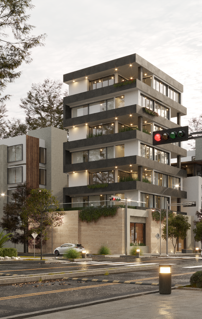 - Escena 3D de edificio y contexto urbano, en Sketchup 2024.