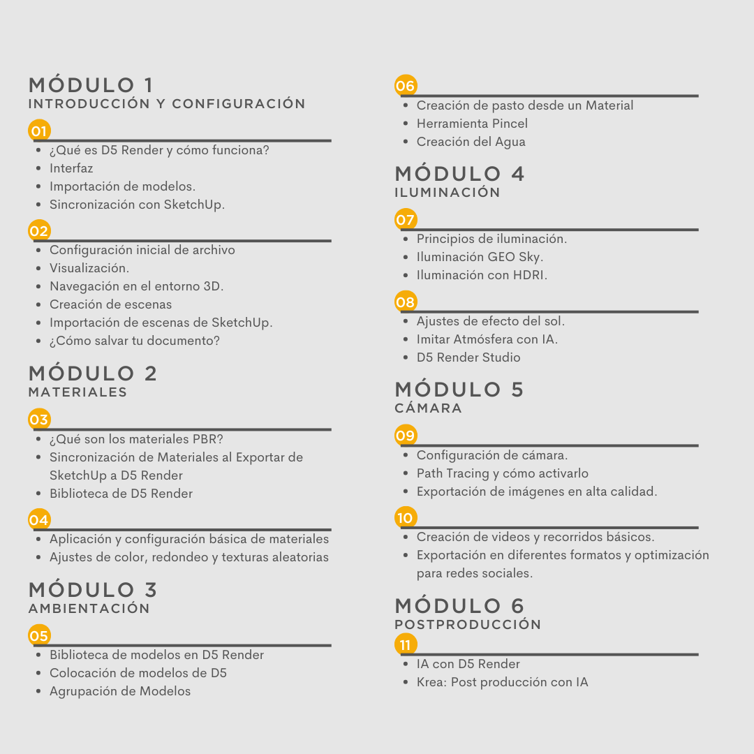 En este módulo aprenderás qué es D5 Render, cómo funciona y cómo sincronizarlo con SketchUp. Verás desde la interfaz hasta la importación de modelos y la configuración inicial para empezar a trabajar en tus escenas de forma ordenada y eficiente.
