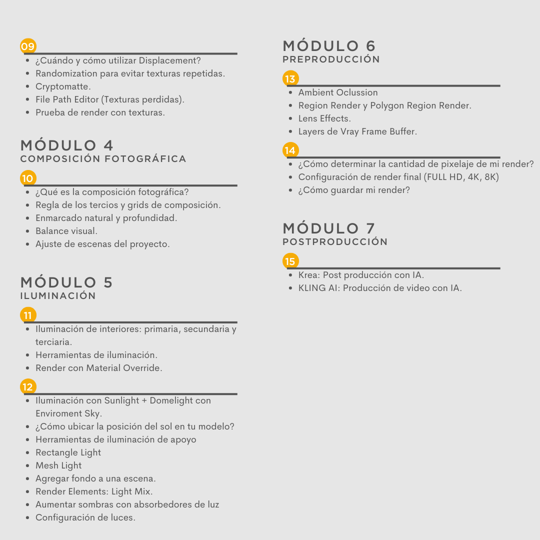 In this module, you'll learn how to work with advanced texture settings using tools such as Color Correction, Bezier Curve, and Ambient Occlusion (AO) maps. You'll master mapping techniques to achieve realistic and detailed finishes in your scenes. You'll also discover how to create textures from images and apply random variations to avoid repetition and give your renders a more natural look.